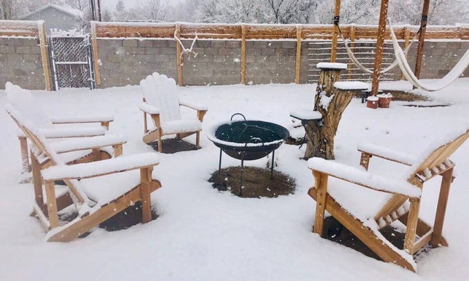 Light the fire pit and live in or out! There are four wooden outdoor chairs for lounging by the fire pit. Or enjoy your meals outside on the metal table with four matching chairs under a string lit ambiance. Pop open the umbrella for shade in the summer. Enjoy reading a book in one of the hammocks under a cedar pergola in the backyard or on the front porch.