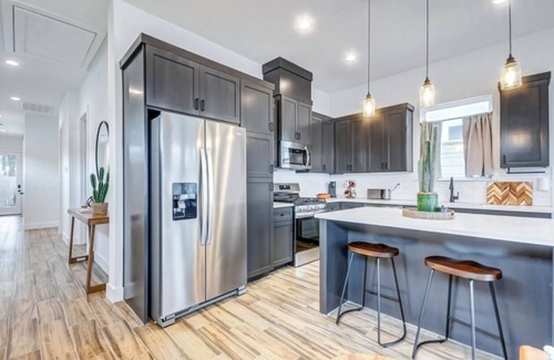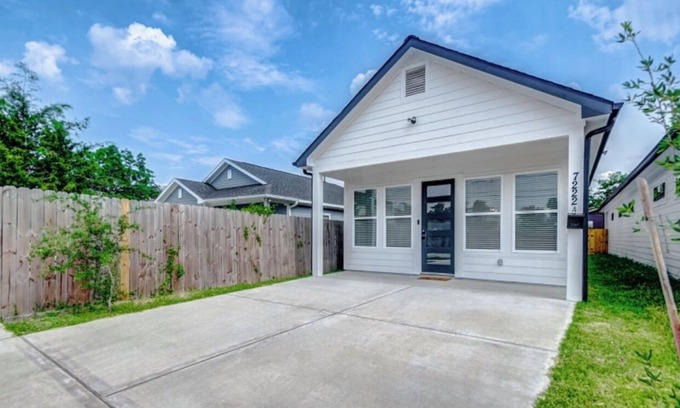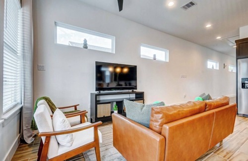 As you approach Casa de Nopales, you'll be greeted by its crisp white facade and striking dark trim to soak in the neighborhood's atmosphere before stepping inside. Inside, the sleek living room features a plush leather sofa, stylish rug and two accent chair's, creating a perfect spot to unwind. Enjoy a high-quality viewing experience on the large flat-screen TV, easily connectable to your favorite streaming apps - movie night, anyone? The kitchen and dining area are a seamless blend of form and function that are a chef's dream. Equipped with stainless steel appliances including a refrigerator, gas stove, dishwasher and microwave. Black cabinetry and a modern white backsplash to give the space a fresh, contemporary feel, perfect for you to whip up some culinary delights or simply savor your favorite meals in this fresh and contemporary space. When it's time to hit the hay, our tranquil bedrooms offer serene retreats with a comfortable king-sized bed, queen-sized beds, two full size beds, crisp linens, and minimalist decor. Large windows fill the rooms with natural light, while soothing tones ensure restful nights. Each room includes ample storage, and one bedroom features an additional TV (can be used as an extra computer monitor) for private relaxation or an office space. The bathrooms boast a clean, modern aesthetic with a walk-in shower, tub shower, marble-style tiling, and sleek fixtures. A spacious vanity with a large mirror provides all the comforts needed for your daily routines. Step outside to the backyard jardin, where you can unwind under the Houston sky. Enjoy morning coffee or evening chats at the charming bench, perfect for quiet time, reading or chisme. Casa de Nopales is designed with your comfort in mind, offering a serene setting with all the modern amenities for a perfect mexican getaway.