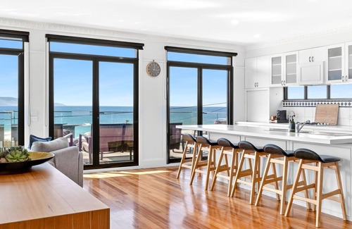 The four generous bedrooms stretch over the ground and split level and guests will enjoy two lounge areas with entertainment options and stunning ocean views. Air conditioning and a cosy fireplace provide year-round comfort, and the large deck is perfect for alfresco dining or winding down after a day at the beach.