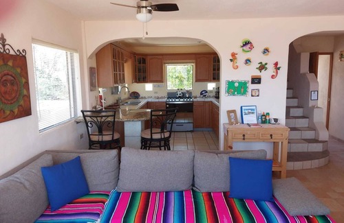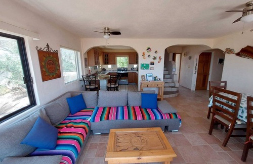 The house has plenty of indoor and outdoor spaces and is surrounded by majestic views of the ocean and the desert. 3 spacious bedrooms sleep comfortably 7 people (2 queen, 1 double, 1 twin). The upstairs sitting area (separate from living area on the main floor) has an additional sofa bed that converts to 2 twins or 1 queen, that is perfect for kids (TV, books, puzzles & games are also available to guests). Two outdoor showers and 2 bathrooms at the house. Gated parking (2 cars) and landscaped garden. Reliable Wifi connection (40Mbps) for your entertainment or if you are planning to work remotely from Casa El Coyote.