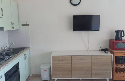 The apartment features two spacious bedrooms, tastefully furnished with comfortable beds and ample wardrobes, ensuring restful nights. The bright and cozy living area is ideal for relaxing after a day at the beach, with a comfortable sofa, flat-screen TV, and dining area.