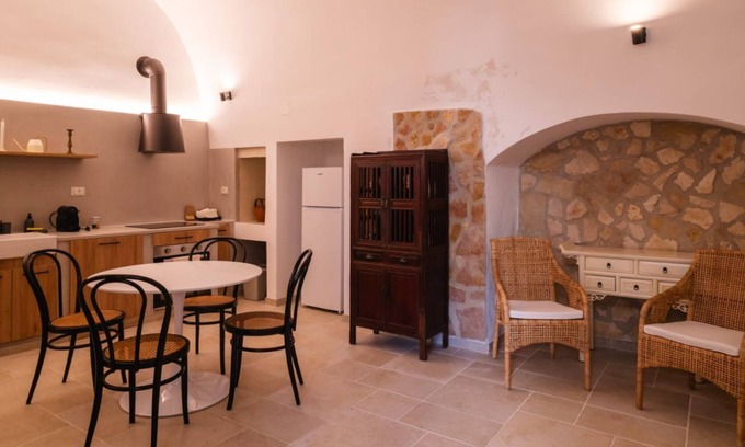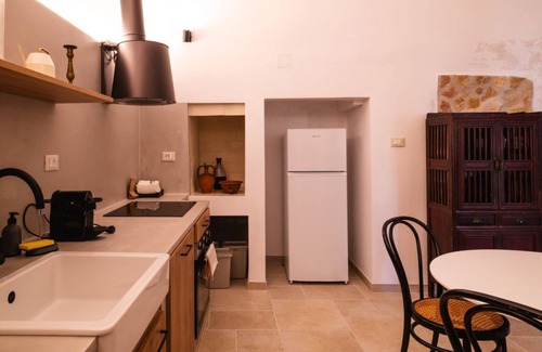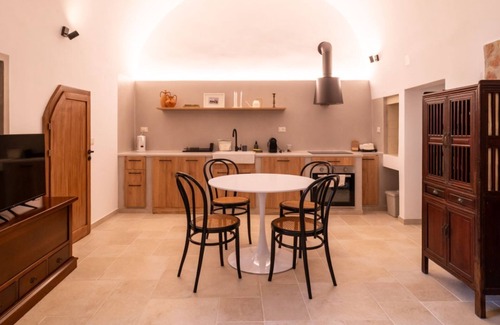 This warm and refined dwelling opens onto a spacious living area, where every detail has been carefully chosen to offer a relaxing, evocative, and welcoming stay. The open-plan space is centered around a modern dining table, ideal for romantic dinners or slow breakfasts with a view of the stone architecture. The kitchen, sleek and fully equipped, is perfect for guests who enjoy cooking even while on holiday — perhaps using fresh ingredients from the local market. Next to it, a comfortable double sofa bed provides additional sleeping space, accommodating up to four guests without ever compromising on style or comfort.