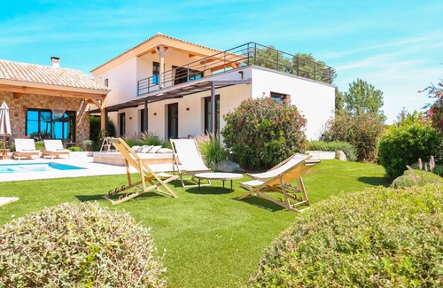 Casa NessaThis dream villa is located just 7 minutes from the beach of Pinarello, in an idyllic and peaceful setting. With 5 spacious and comfortable bedrooms, this property can accommodate up to 12 people, offering an elegant and modern living space for an unforgettable holiday with family or friends.INTERIORVilla of 230m2 with a plot of 1500m2 composed of 5 bedrooms and a large room facing the pool.The living / dining room with an area of about 80m2 has large openings overlooking the pool and the terrace.The villa is also equipped with a modern kitchen (2 refrigerators, grain machine, capsule machine, toaster, kettle, juicer, etc.) and a scullery with wine cellar, a spacious and bright living room with a fireplace, a dining room for 12 people and an outdoor terrace with barbecue for unforgettable evenings outdoors.A guest toilet with hand wash.The sleeping area is composed on the ground floor of 4 bedrooms and a master suite upstairs.Bedroom 1: Queen size bed (160* 200) with shower room, toilet and closet. Pool and garden access.Bedroom 2: Queen size bed (160* 200) with shower room, toilet and closet. Pool and garden access.Bedroom 3 / cinema room: 2 * Queen size beds (160 *200 - trundle bed) that can accommodate 4 people. The room is composed of a toilet and hand wash and a storage chest of drawers. The room is composed of a retro-projector and a white canvas. Ideal place for children. Accessible only from the garden. Pool and garden access.Bedroom 4: 1 Queen size bed (160* 200) with shower room, toilet and closet. Accessible only from the garden. Pool and garden access.Bedroom 5: Master suite with a King Size bed (180 * 200) with dressing room, shower room, toilet and a large shaded terrace.EXTERIORThe villa is composed of a beautiful heated swimming pool of 10m * 5m with alarm. The area around the pool is beautifully landscaped with sunbathing areas and relaxation areas with mattresses and cushions.A petanque court is located at the back of the villa. The space is illuminated with a relaxing seating area and speakers are integrated to enjoy the music while playing.An outdoor dining area is equipped with a WEBER charcoal barbecue.A table tennis table is available.An outdoor toilet is also available.EQUIPMENTThe villa is equipped with a mosquito repellent system all around the villa.The villa is equipped with WIFI and is fully domotized: underfloor heating, shutter, lighting, alarm.The villa is fully air-conditioned (individual in each room)Speakers are installed inside and outside the villa.ADDITIONAL INFORMATIONThe tourist tax in force will apply depending on the number of adults per night.A deposit via bank imprint will be requested before entering the premises: 6000 euros.LOCATIONThe villa is ideally located for exploring the surroundings, with restaurants and shops nearby. Pinarello Beach is just a 7-minute walk away via a small private path, offering a beautiful white sandy beach and crystal clear water. Porto-Vecchio is located 16.8 km from Porto-Vecchio and 4.6 km from Saint Lucia.