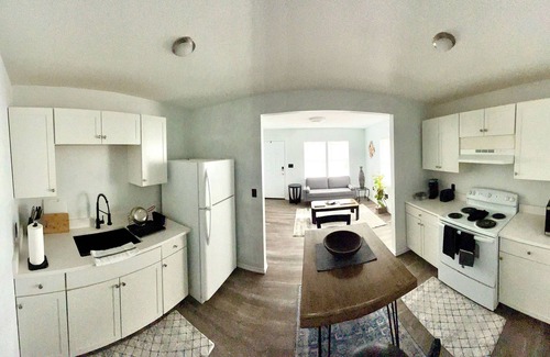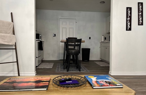 A stand alone small home that is tucked away from the street, behind a front duplex. Off street parking, a fully stocked kitchen, a flat screen TV, full bath, plush bed, blackout curtains, all utilities paid, spacious living area and high speed internet make it feel like home even if you're away from home. Work or play...this is a perfect place for you.
