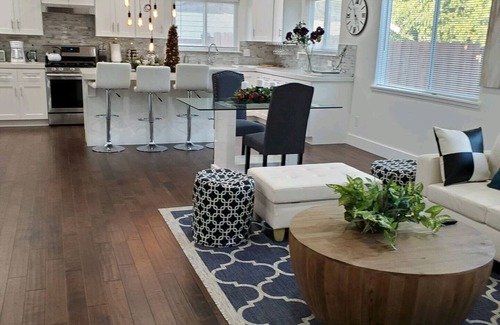 We put a lot of love into this place. The place has a lot of natural lighting. The open kitchen and living room concept design will make you feel very free. The modern design will allow you to feel relaxed. Most lights at the place are dimmable. Allowing you to set the mood just right! There is an electronic fireplace perfect for those cozy moments. The large master bedroom has a full bathroom. Each room has queen-sized beds and closets. You will find four multifold mattress in the closets. The back and front yard are very spacious with plenty of places to sit. The backyard has a gazebo with a dinner table. There is a small bbq and fire-pit. You will love the place!