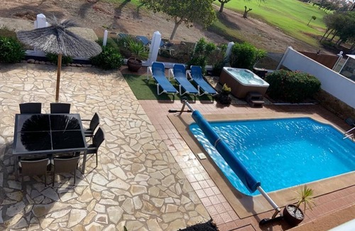 Beautifully appointed villa, spacious enough to cater for families/parties of 8 in Caleta de Fuste. Outdoor pool table. A bright and airy feel, with high ceilings, a large family lounge and separate dining room. The air-conditioning is remote controlled separately for each bedroom and the living room. The terrace and patio areas again give the feeling of space and look directly over the 5th green of the Fuerteventura Golf Course. Two 'Al Fresco' seating areas and plenty of sunbathing space. Two fixed sunbathing parasols have been positioned to allow a shady spot. A Cabana with soft seating for relaxation. 5 person hot tub with lights and Bluetooth speaker. Large swimming pool (8x3.3m) Indoors, guests may relax and watch Our TV with a mix of different channels. The villa has a 'strictly no smoking inside' policy but smokers are invited to take full advantage of the outside patio areas. The Atlantico foreshore with beautifully kept lagoon beaches, four hotels, superb supermarket & shops is just a ten minute stroll away.