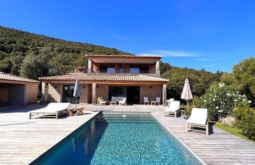 CASA SARRASuperb sheepfold style villa in stone and "wood" cladding composed of 4 bedrooms with sea view, pool house and swimming pool just 15 minutes walk from the beach of Pinarello.MAIN ASSETS- Beautiful landscaped exterior with pool house- Heated swimming pool- Sea view- Beach within walking distanceINTERIORThe villa is composed of an entrance hall with guest toilet.A living / dining room area with a fully equipped American kitchen (oven, microwave, kettle, SMEG juicer, toaster, refrigerator and freezer, SMEG filter coffee maker)A laundry room with washing machine and dryer. An iron and an ironing board are also available.Two bedrooms are located on the ground floor :Bedroom 1: Double bed 140 * 200 with shower room and access to the garden. Air conditioning.Bedroom 2: Double bed 140 * 200 with shower room and terrace access. Television, air conditioning. Pool and sea view.Upstairs, there are the two main suites :Bedroom 3: Queen Size bed 160 * 200 with shower room and sea view terrace. Television, air conditioningBedroom 4: Queen Size bed 160 * 200 with shower room and sea view terrace. Television, air conditioningWifi with 4G BOX. Air conditioning in all rooms. Two hair dryers are available.OUTDOORThe villa has a very beautiful exterior completely landscaped and landscaped.You will have a pool house with sink, refrigerator, dishwasher, Nespresso coffee machine and portable ice maker.The terrace has an outdoor lounge, two single sunbeds and a double sunbath with two umbrellas. An outdoor shower is also available.The parking of the villa can accommodate about 3 or 4 cars.The garden is completely fenced.LOCATION1 km from the sandy beach "Pinarello"2 km from the restaurant "Marine Village of Pinarello",6 km from the supermarket "Super U",6 km from the city "Saint Lucia of Porto-Vecchio",7 km from the sandy beach "San Ciprianu",9 km from the sandy beach "Cala Rossa",12 km from the river "Natural Pools of Cavu",16 km from the city "Porto-Vecchio",23 km from the golf course "Golf Club of Lezza",24 km from the sandy beach "Santa Giulia",26 km from the sandy beach "Palombaggia",37 km from the airport "Figari",44 km from the city "Bonifacio",47 km from the golf course "Golf de Spérone",117 km from the airport "Bastia"ADDITIONAL INFORMATIONParties and pets are strictly prohibited.The area is residential and quiet, it is important to respect the neighborhood.The tourist tax in force applies per adult and per night.A deposit of 3,000 euros will be requested before entering the premises.The garage visible in the photos is not accessible.