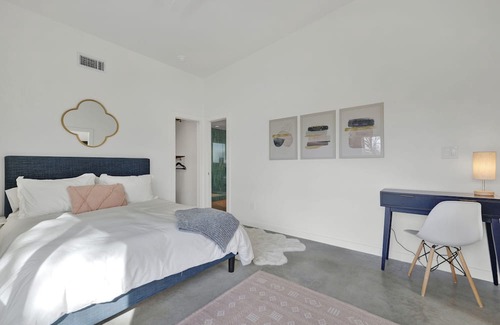 A uniquely tiled bathroom in brilliant shades of blue-green houses an oversized glass shower, providing a luxurious and refreshing experience. Both bedrooms feature queen-sized beds and offer captivating views of the surrounding natural landscape, allowing guests to awaken to the beauty of the outdoors each morning. For those who prefer a bit more sleep, blackout shades are available.