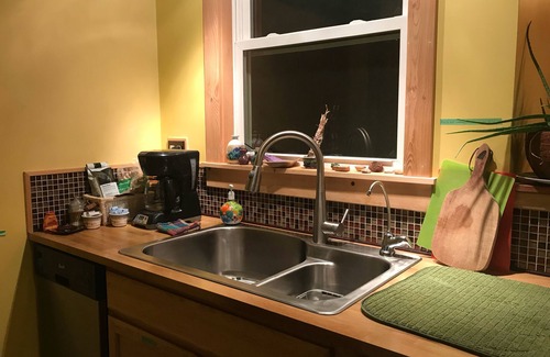 Bedroom sleeps two, with a plush queen size bed! Futon in living room for two additional guests and additional lounging opportunities. Full bath, stove, fridge, ample kitchen wares and appliances, condiments and breakfast fixings, at a minimum, are included (usually eggs, bread, butter, coffee, creamer, teas). Parking for one car (turn around much trickier with two cars and inadvisable). Road and narrow drive passable for car/passenger truck/SUV, but NOT for larger vehicles or trailers (very limited turn around).