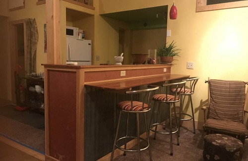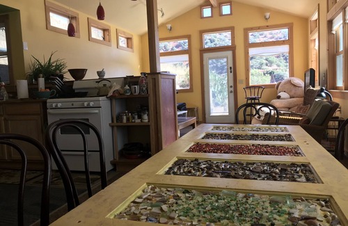 Living room features a dining bar adjacent to kitchen. Dining table is classic Bisbee style, with repurposed 1920s bedroom door serving as a long, Italian, family-style dinner table (glass top with Bisbee hillside and Italian Beachside treasures underneath)!
