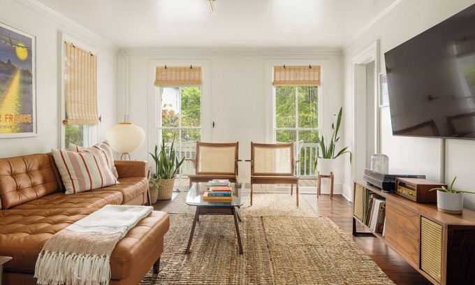 Perfect for entertaining or relaxing, Casa Tivoli features an open concept floor plan that seamlessly connects the living areas. The fully remodeled kitchen boasts new appliances, and the space integrates with the living area to create an inviting atmosphere. The original floors have been leveled, sanded and refinished to preserve the home's character while providing a fresh look. There are two renovated bathrooms, one with a washer and dryer for added convenience. Upstairs, you'll find three light-filled rooms. Smart thermostats ensure modern comfort throughout.