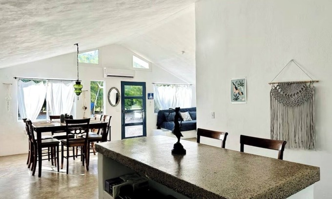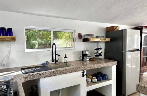 Discover the beauty of Mulegé from this bright and cozy one bedroom casita, walking distance to town and nestled in a private palm grove. Pick oranges, limes, tamarind, and guava straight from the tree (depending on the season). The bedroom features a high quality king bed, perfect for a serene night's sleep. The chorus of songbirds will gently wake you in the morning and if you decide not to visit the nearby white sand beaches during the day, you can pass your time watching all the birds pass by. Stay comfortable no matter what the season with both AC and heat while being productive on the high speed WiFi or lazying around on the smart TV. The living room offers 2 twin beds for additional sleeping space. With a fully equipped kitchen, you can cook all your favorite meals or walk/drive to town and sample one of the many great restaurants in Mulegé. The property is fully fenced and there's an additional layer of fencing attached directly to Casita Azul so your dog(s) can have fun exploring the space as well. We're happy to assist with any questions you may have during your stay at our sweet little casita and we look forward to hosting you.