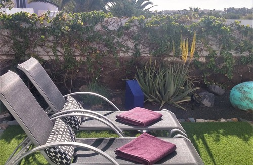 Casita Maracuya is surrounded by a lovely private garden, with direct access to the Jacuzzi pool, facing south-east with views of the sea and Corralejo bay, rest is assured.
