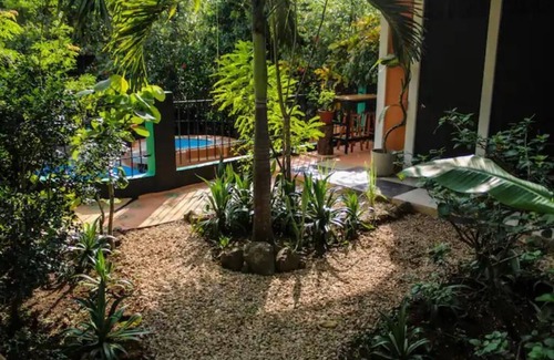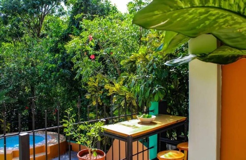 Step into the sweet outdoor kitchen, offering an epic pool view to watch the Howler monkeys swing as you brew your morning coffee. The bedroom beckons with a comfortable double bed featuring a memory foam mattress for a restful night's sleep. Complete with modern amenities, the room boasts AC, a TV equipped with Netflix, WIFI, and a clothing rack nestled between two bright windows, creating a cozy retreat.