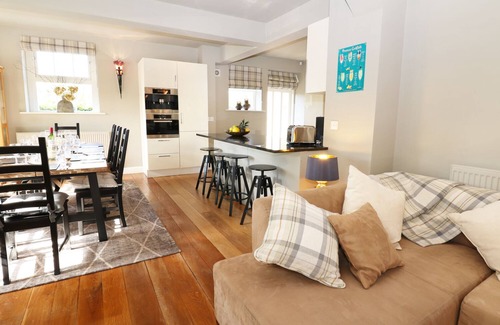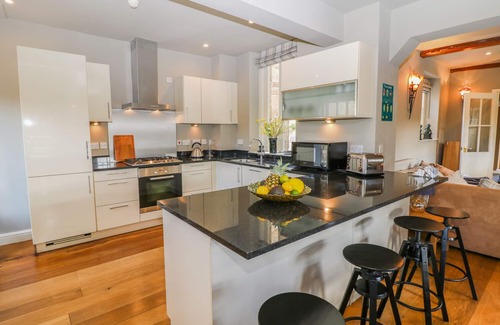 Castle Hill is part of a Georgian Grade II listed building set within a courtyard in Bakewell. It comprises four bedrooms; three super king-size doubles with zip/link beds, one with en-suite bathroom, and a ground floor super king-size double, sleeping eight people altogether. No infants or children under 5 years old can be accepted. The interior also boasts a bathroom, ground floor cloakroom with utility area, along with an open-plan living room with kitchen, dining area and sitting area. To the outside is off-road parking for 2 cars and a patio area to the side with furniture. Castle Hill is a luxurious getaway in the heart of the Peak District National Park.