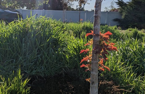 The koi fish in the pond are 3-4 inches still but they are very pretty and their white and orange scales really pop against the black pond liner and they love to dart around together.