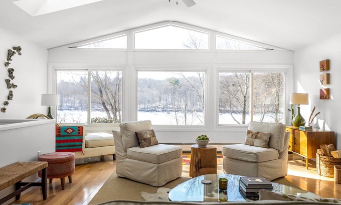 It's cozy in the Catskills! Updated luxe MidCentury bungalow 90 mins from NYC. Enjoy coffee on the dock or deck, sit under the stars by the outdoor fire pit, or snuggle up beside the wood burning stove. 3 beds, 2 baths, fully equipped kitchen, large dining and living areas. Minutes to Callicoon, Livingston Manor, Narrowsburg, Bethel Woods (site of the Woodstock Music Festival), spas, Catskills Casino, Katrite Waterpark, Monticello Racetrack. Canoe, kayaks and a stand up paddle board on site for guest use.