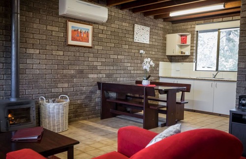 Living area, kitchen, dining and bathroom are downstairs. Each chalet has a log fire plus reverse cycle A/C for those chilly nights. You are welcome to use the log fires, fire wood is available by the bag at all good service stations and hardware stores for you to purchase. Each chalet is equipped with a washing machine. Along with all of your usual crockery and cutlery, kettles, toasters, convection/microwave, fridge/freezer. There is a playground for the kiddies and plenty of land for the older kids to run around with their football, play cricket or whatever they fancy, BYO Sport things.