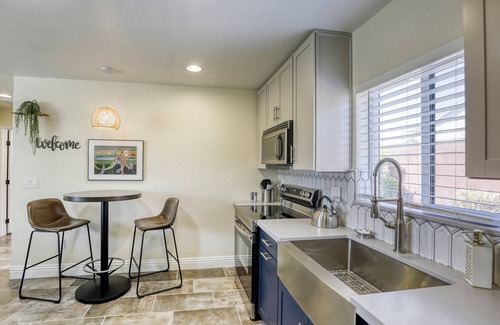 Desert Rose Guesthouse is a private, freestanding apartment with 599 square feet of pure luxury. Perfect for singles or couples, there is a separate master bedroom with king bed featuring a comfortable yet supportive organic cotton mattress for your best sleep ever. The bedroom windows are equipped with blackout curtains to insure that you will be able to sleep late if you desire. A walk-in closet and French doors opening to a large West facing patio complete the bedroom suite. Meal preparation is made easy with a fully equipped kitchen featuring full sized refrigerator, stove and farmhouse sink. Enjoy your meal at the bistro table for two. After dinner, relax in the comfy sitting area with deep cushion couch and extra guest seating, perfectly set up for surfing the net, conversation or tv viewing. The smart tv streams Hulu & other favorites via ROKU. Other amenities include a full sized bathroom with walk in shower, and laundry area with full sized washer and dryer. The home is equipped central A/C and heat wireless wifi and wired ethernet (your choice). Security features include keyless entry, dead bolt locks on all exterior doors and exterior motion sensor lights around the fully walled & fenced yard. Driveway parking is just steps away from the front door. A serene and orderly yard with beautiful desert landscaping surrounds the home.