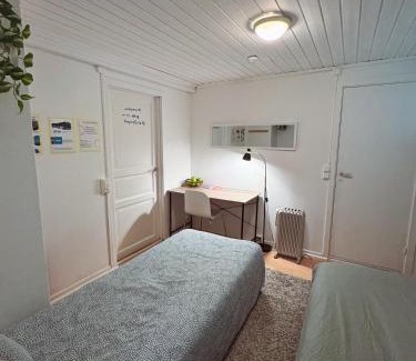 BathroomFree toiletries, Bathtub or shower, Toilet, Shower, Shampoo, Body soap, Toilet paper, TowelsKitchenElectric kettle, Stovetop, Oven, Washing machine, Refrigerator, Kitchenette, Wine glasses, KitchenLiving AreaDeskGeneralSmoke Alarm, Fire extinguisher, Private entrance, Heating, Trash cans, CarpetedBedroomLinensRoom AmenitiesSocket near the bed, Clothes rack |