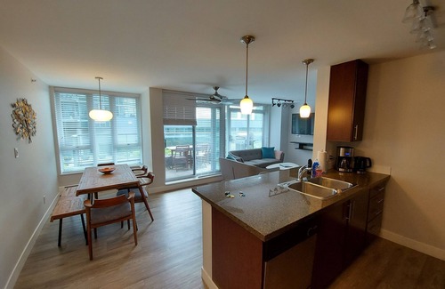 Modern, spacious suite allows for creative space and relaxation in the heart of Vancouver. Features a large patio with easy access to fresh air and views overlooking the local ducks in our courtyard pond. The primary bedroom has a king sized bed, small closet with hangars, and full ensuite bathroom; the second bedroom has a queen sized bed with storage drawers underneath, and a large closet; the third bedroom has a double bed and office desk with drawers for storage. The living room couch is new and has a pull out double bed with new memory foam mattress.