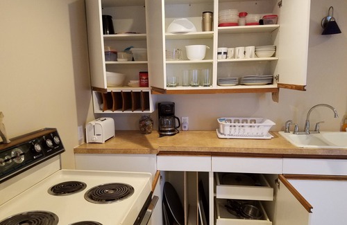 You will be the only guests lodging in this home. Located on a quiet street. Use keypad entrance. Ranch style layout. Plenty of on site parking .Nice backyard with patio. grill and fire pit. Several small eateries within walking distance. The inside is very clean and updated.!! Two bedrooms with a queen sized bed, tv and dresser in each. Additional one blow up twin mattress, so can accommodate 5 guests. Spacious living room/kitchen areas, with couches & T.V. & kitchen table. Plenty of stocked kitchen accessories for you to cook at home! One bathroom with tub/shower. plenty of towels & linens, and other necessities. Washer and dryer on site. Small locked box safe installed in closet.