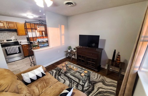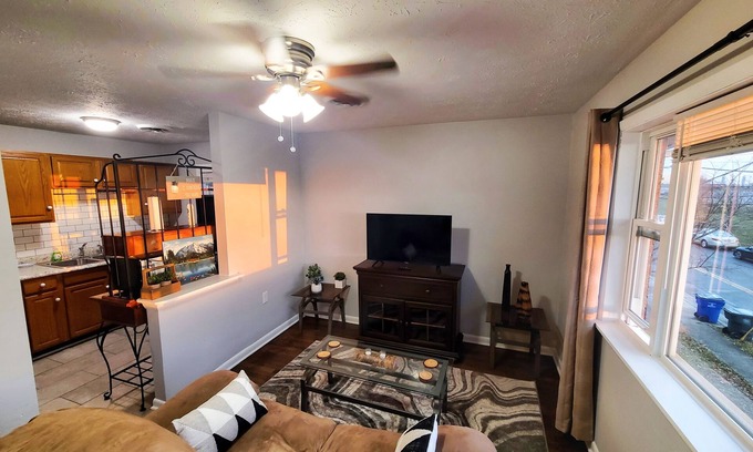 The apartment building is located in a well-lit and safe area with exterior doors that stay locked. Avoid expensive parking near campus/downtown by utilizing the off-street parking spaces provided behind the building for guests only. (One space per bedroom booked) A few minutes' walk will put you at the nearest bus stop where you can utilize public transportation to traverse across Lexington. When it's time to drive out to explore all the scenic and beautiful locations across Kentucky like the Gorge or Mammoth Cave, your vehicle will be waiting for you there safely. Don't forget about the Bourbon Trail! Once you're ready to relax and unwind, you'll find that the apartment is equipped with all the conveniences you need to recharge in comfort. A large flat screen smart TV is there for your convenience. Utilize your favorite streaming services to catch up on your favorite programs while lounging on the couch. Rest easy knowing that each apartment has adjustable AC/heat and each room is equipped with blackout shades and a box fan which is useful for white noise. Night owls and early risers will also appreciate the coffee maker located in the full kitchen. Whether you plan to eat out and dine at local restaurants or prepare your own meals, you'll be set during your stay. It would be our pleasure to provide any recommendations and tips during your stay. Feel free to reach out to us anytime!