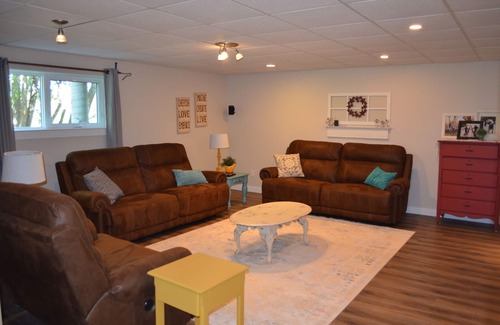 Guests are sure to enjoy a memorable vacation in this fully furnished, 6 bedroom/2.5 bath home. Country Living has 3420 sq feet of living space and acres of outdoor living. The main/master bedroom has a queen-sized bed with en-suite and jetted tub. The downstairs contains four bedrooms, a large living room with a new smart TV with surround sound and mood lighting, two new power reclining couches and a new power reclining love seat and stocked with lots of games. Bedroom 2 has a double bed in it, comfortable for sleeping 2. The other three bedrooms in the downstairs are furnished with a queen-sized bed, comfortable for sleeping 2 people. One of the queen bedrooms has a crib for a baby and a pack and play. The loft area has three twin beds. There is also a futon in the laundry room that can be used.