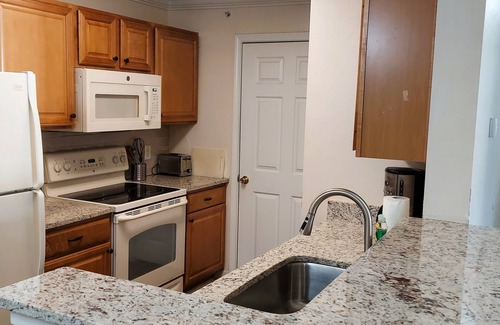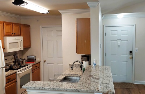 Spacious third floor condo with two bedrooms, one bathroom, a fully equipped kitchen, dining room, living room, sun room and office space, and a laundry room with a full-size washer and dryer Condo has a comfortable sofa sectional for your lounging needs, an entertainment center that offers a smart 42" HDTV flat screen television for all your entertainment needs. For those who prefer to spend time with a good book, you will find many novels and books to be enjoyed in the sunny sunroom where you will also find an office area. The kitchen is fully equipped with everything you need to cook a meal. For your sleeping comfort, the master bedroom offers a very comfortable and luxurious king-sized mattress, and the second bedroom offers a queen sized memory foam mattress. The bathroom is an oversized rectangular bathroom with a soaking tub/shower combination as well as a separate stand-up shower, double sink vanity with ample lighting, and a linen closet. The bathroom has two separate entrances, one through the master bedroom and another through the hallway for easier access.