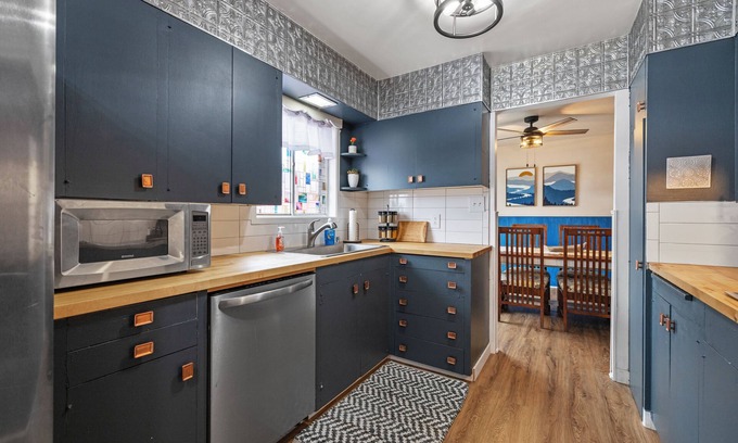 Spacious 4 bed 2 bath house with 2 living rooms. Each of the three bedrooms downstairs has a queen bed, one has a workspace with desk. The upstairs bedroom has a queen bed and a twin bed with a twin trundle. Take your time wandering through and enjoy our appreciation for the great outdoors, whether it’s Oregon or the National Parks we love the most, we hope you find some art to talk about.