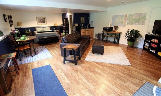 The studio is the full downstairs of our family home that has its own entrance. It has a queen bed and queen sleeper sofa with Direct TV and free WiFi. You are able to connect your personal entertainment accounts through an Apple TV. The kitchenette has a microwave, fridge/freezer and a Kuerig with tea, hot cocoa and plenty of coffee. Relax in the large outdoor yard that is private from neighbors and a great space to enjoy the Alaskan summer.