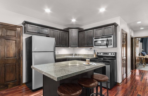 Inside, relax in a spacious living room complete with a smart TV and Wi-Fi, perfect for unwinding after a day of exploration. The fully equipped kitchen caters to your culinary desires, whether you're whipping up a full meal or enjoying local coffee from the downstairs café. The bathroom features a full-size walk-in shower, ready to refresh you after a day of adventure.