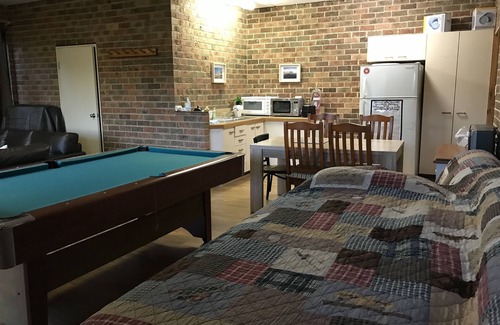 Downstairs comprises a rumpus room, 1 bedroom and bathroom. The rumpus room has a 65" Smart TV, pool table, gas log fire, king single bed, trundlebed, a chairbed and a wet bar. The bedroom has a king bed with Tempur mattress. The bathroom has a bathtub, shower and toilet. Downstairs can sleep 4 people.
