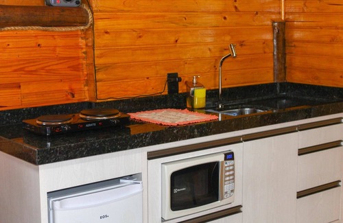 - A cozinha é equipada com todos os utensílios necessários para preparar suas refeições, incluindo fogareiro elétrico de bocas, frigobar, microondas, sanduicheira, balcão e mesa com poltrona