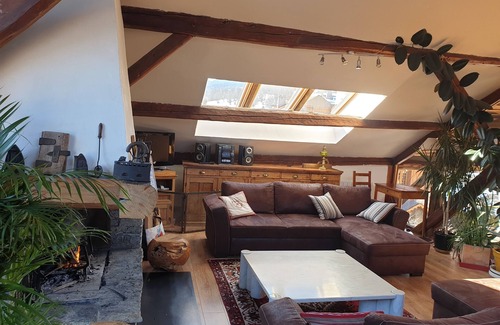 - Large living room on the top floor where you can enjoy the fireplace in the sofas under century-old beams or bay windows overlooking the mountains.