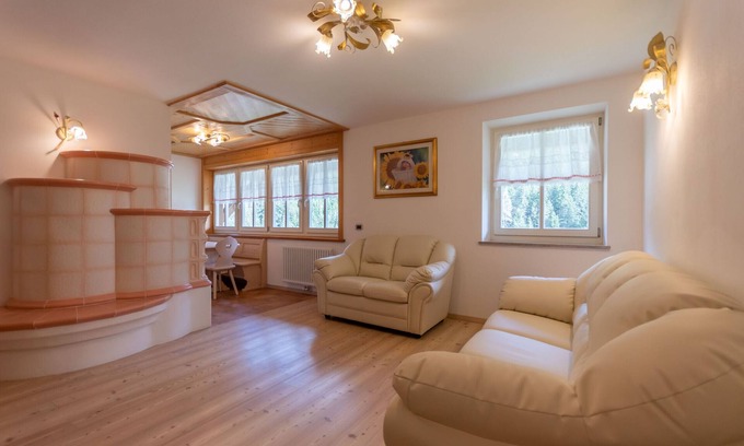 The apartment is located on the second floor (door to the right) of a modern little house, it has just been renovated and it is cared for in every detail. The large spaces give privacy to all guests who will have a really pleasant stay. The wooden furniture and ceilings decorated in typical Ladin style infuse the rooms with the warmth and tradition typical of the Fassa mountains.