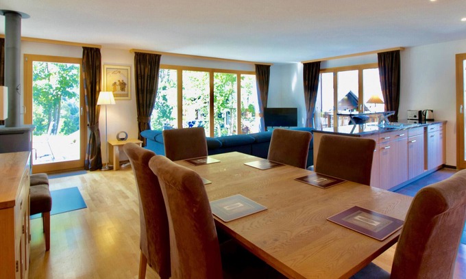 Chalet Fortuna 2 is a 3 bedroom 1st-floor vacation apartment with great views of the Jungfrau from its south-facing terrace. Nicely situated in a quiet area, it’s only a short level walk to the center of the family-friendly “car-free” village of Wengen, making it a prime choice for convenience and comfort!This apartment sleeps up to 6 people:Bedroom 1 = 2 single / twin beds (can be joined or separated)Bedroom 2 = 1 double king-size bedBedroom 3 = 2 single / twin beds (can be joined or separated)All beds are European sizes.Bathroom 1 = en-suite with shower and WCBathroom 2 = bathtub with shower overhead and WCBathroom 3 = en-suite with shower and WCApartment location - Just a 350m level walk from the train station, 300m to the nearest grocery store and 450m to the cable car and nursery ski slopes, mountain hiking and ski areas are just a few steps away!Top finishes and attention to detail are evident throughout this bright and spacious apartment. It has all the comforts of home, with three charming bedrooms along with three modern, immaculate bathrooms. The open plan living/dining/kitchen area is well equipped and includes a filter coffee machine and microwave, along with free WiFi, cable TV, radio and iPod docking station for entertainment.A Swedish wood burner and comfortable furnishings create a cozy ambience and a west-facing balcony and sunny south-facing garden terrace extend the living space to the outdoors. Here you can enjoy alfresco dining and relax while soaking up the sweeping views. The Jungfrau mountains and Lauterbrunnen Valley provide a dazzling backdrop! In winter or summer, Chalet Fortuna 2 is a very attractive and comfortable choice for your Alpine holiday in Wengen.There is ski and boot storage in the basement, and a washing machine and tumble dryer in the apartment.Get 20% off ski rentals at SkiSet Wengen when you book this apartment.What you should know...Although Wengen is a "car-free" mountain village, arriving by car is no problem. There is a large multi-storey car park at Lauterbrunnen train station, with trolleys for your luggage and lifts to the station platforms. It is just a 14-minute scenic cog train ride up to Wengen. The trains depart every 30 minutes until 9.30 pm and then hourly. Taxis are available for hire at Wengen train station if required.For those planning to explore the Jungfrau region, we at Wengen Apartments offer the convenience of purchasing tickets on your behalf. Please contact us before your arrival to arrange this service. As part of your booking, a mandatory non-refundable damage waiver of CHF 35 is required. This waiver offers you protection against accidental damage during your stay, ensuring peace of mind without the need for a traditional refundable security deposit.