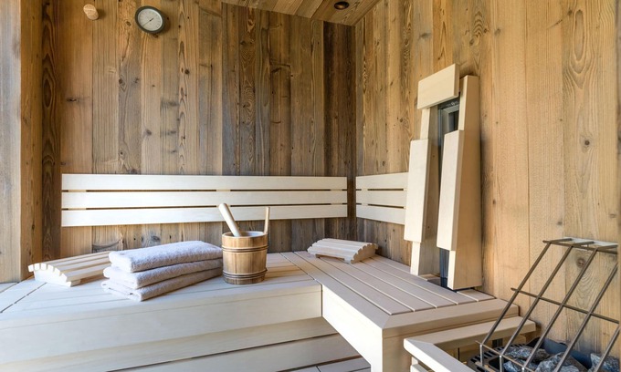 Layout: Ground floor: (Living room(single sofa bed, TV), open kitchen(dining table, hob, electric kettle, coffee machine, oven, microwave, dishwasher, fridge), bedroom(double bed), bathroom(shower, washbasin), toilet(toilet)) On the 1st floor: (bedroom(double bed), bedroom(double bed), bathroom(shower, washbasin, washbasin), toilet(toilet), sauna(infrared sauna, sauna), balcony, air conditioning) Turkish steambath(shared with other guests), ski storage(shared with other guests), terrace, garden, garden furniture, parking