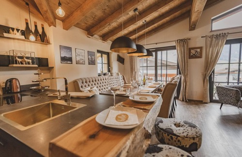 This beautiful residence in the right wing of a semi-detached house surprises with its modern, atmospheric interior. The abundance of wood combined with high ceilings, lots of glass and elements from the mountain world create a unique atmosphere. After a nice day, you can relax in your own sauna and from the living room you have access to the balcony with glass wall. It feels just like being in the middle of the mountains here!