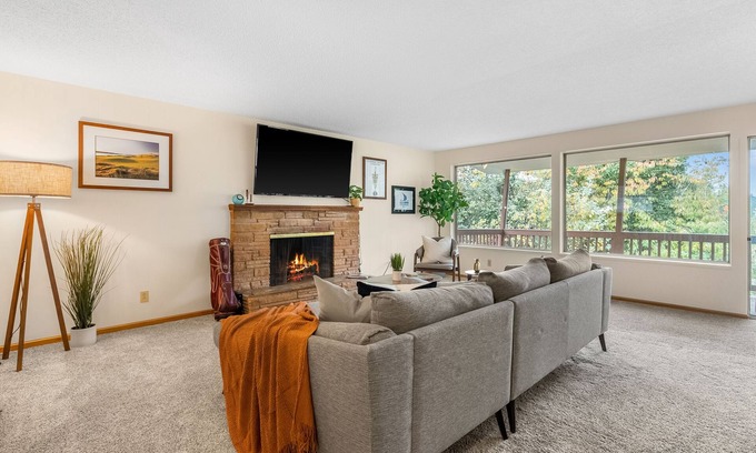 Then, relax in our living room looking out at our nature surroundings through our mid-century modern style picture frame windows. You can watch your favorite streaming app on our 65" smart tv. Or, unplug yourself and enjoy reading our Chambers Bay and PNW magazines. We have puzzles and cards located in the kitchen cabinet in the dining room as well. You can also take in the fresh air on our private balcony. Can you find the Tacoma Narrows Bridge?