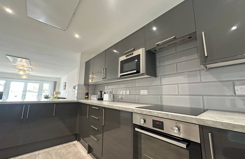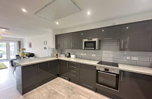 The open plan kitchen-living area with french doors onto the driveway gives the space a light and airy feel. The living room has a zesty green decor giving a brightness to the room making it a comfortable setting to enjoy your favourite streaming services. The dining table and breakfast bar make the room feel sociable. The kitchen has plenty of space and a breakfast bar for a more sociable feel. The kitchen is well equipped with utensils, crockery, a kettle, toaster, microwave and basic pantry items such as oil, salt and pepper. Additional kitchen amenities include an oven, hob, refrigerator, freezer, washing machine and tumble dryer. These amenities ensure you have access to everything you need for a short- or long-term stay.