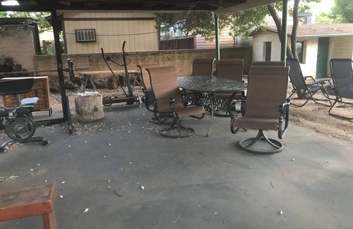 Our carport covered workout area also has a firepit and rocking chairs to relax in after a long day of touring. We also have a half-bathroom with a toilet and deep sink next to our laundry washing machine and dryer, which are available for your use--just twenty steps from the guesthouse, next to our garage.