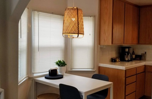 Our home is a sunny and bright 2 bedroom, 1 bath cottage built in 1949. It features a cute bay window with dining nook for 4. Lots of windows let the breeze in. We have two 50" smart TVs - one in the family room and one in the 2nd bedroom with Netflix. Second bedroom features a vintage rattan trundle bed and futon. Master bedroom has a queen bed with new memory foam mattress, desk and fast WI-FI for work. Kitchen is ready for you, stocked with locally roasted coffee. Out back we have a grill, two lounge chairs, hammock and grass. Out front is a large 12x20 deck with outdoor furniture. Sleeps 4-5.