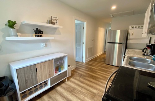 Unwind in the living room, perfect for four guests, where you can catch up on work at the modern workspace or enjoy your favorite shows on the SmartTV with high-speed Wi-Fi. The kitchen is ready for your culinary adventures, stocked with basic cooking supplies, utensils, coffee, and tea. After a day of exploring Charlotte, mix a cocktail at the wine bar, complete with all the glassware and tools you need to craft the perfect drink.