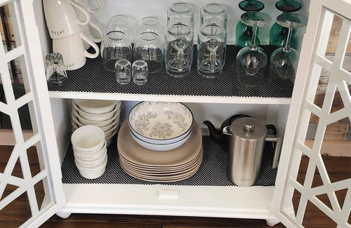 The indoor kitchen area has everything you will need, pots, pans, utensils, dishes, serving dishes, a mini fridge, a hot and cold drinking water dispenser, a french press, a tea pot and a sink for washing dishes.