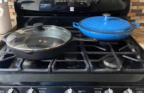 Kitchen has granite countertops and is fully equipped with pots and pans, air fryer, coffee pot with coffee , coffee cups, Cookie sheets, and everything you need to prepare a meal. A few basic seasonings also.