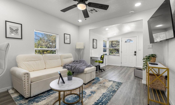 Nestled in Tampa, this delightful house offers 2 bedrooms - one with a queen bed and the other with a twin bed. The bathroom comes equipped with a hair dryer and a bathtub for your convenience. In addition, there is a cozy living room with an extra queen bed and twin bed. Guests can enjoy amenities like WiFi, heating, AC, and a washing machine during their stay. We hope you enjoy what our place and Tampa has to offer.
