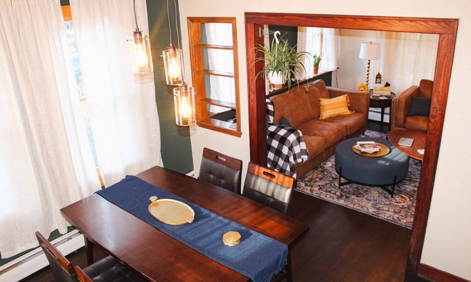 The house features a galley kitchen with bar seating, dining room, living room, half bath and nook with an extra twin XL Murphy bed on the first floor. There is a full couch, as well as a loveseat couch in the living room connected to the 6-seat dining room where guests can relax. Connected to the living room is a spacious front porch with rocking chairs and a small outdoor loveseat. On the second floor, there are two bedrooms (one king bed, one queen bed) and a full bathroom. On the deck in the backyard, there's a table with an umbrella and chairs. The garden out back is a beautiful place to relax in the summer when the roses and hydrangea are in full bloom.