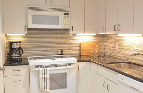 Step into a space adorned with high-end furnishings, an open kitchen with breakfast bar, granite countertops, custom tile backsplash, and a convenient dishwasher. The home also offers a private in-unit washer and dryer, wood floors in the living room, and two HDTVs for your entertainment.