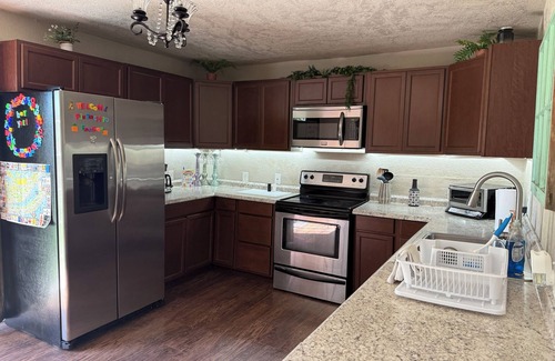 Discover this superb 2-bedroom gem in Hitchcock. This pleasant house features 1 king bed, 1 queen bed, and 2 bathrooms with a hair dryer. The living room offers an additional space with a cozy sofa bed. With amenities like AC, Wi-Fi, and a washing machine, guests will feel right at home. It's easy to see why you'll be able to unwind at our place. Fully fenced private yard ideal for your children and fur babies! This is a quiet, established neighborhood with great neighbors. Fire pit available for use. Toddler bed available upon request.